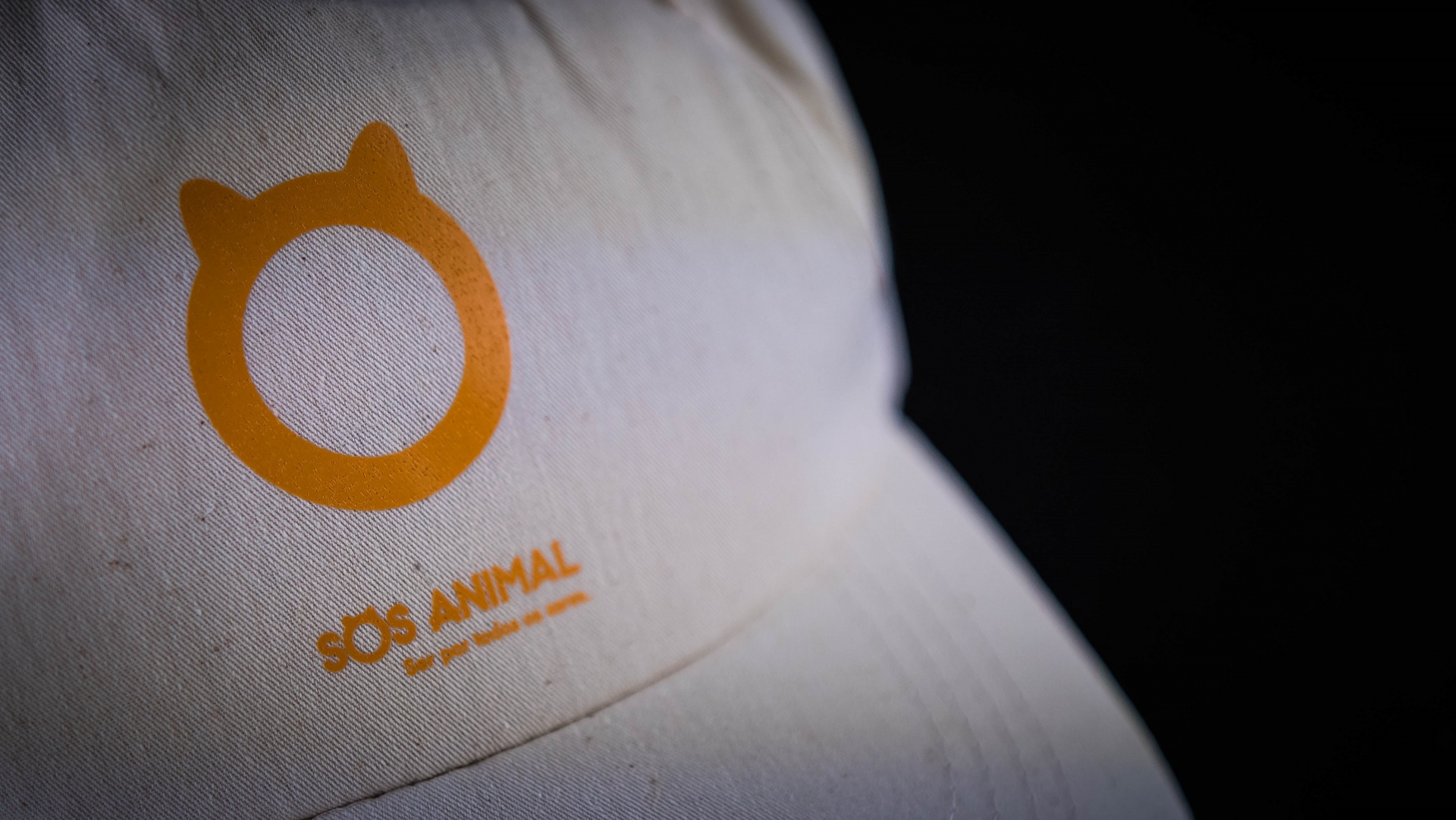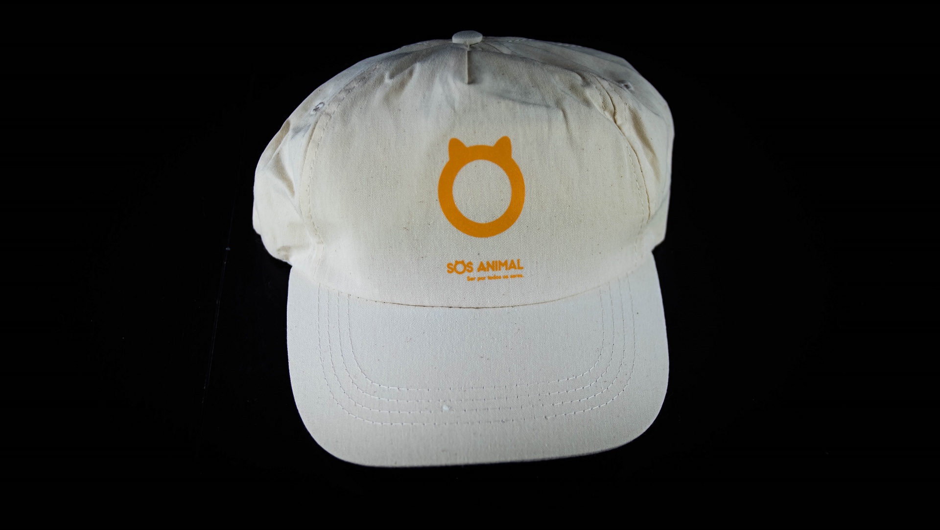 Boné branco com logo laranja e texto SOS ANIMAL