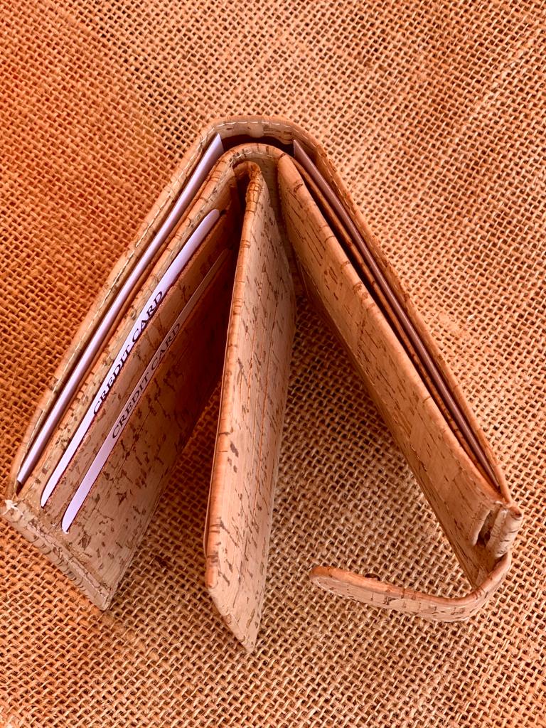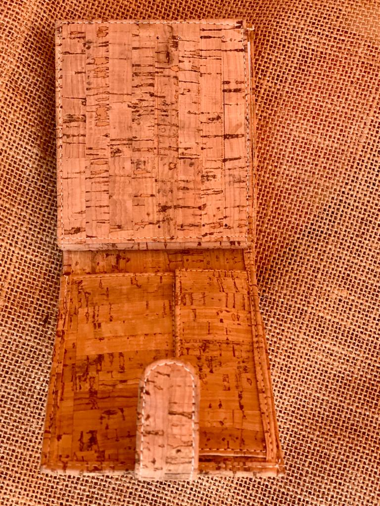 Carteira de homem de cortiça com porta moedas, acondicionada em embalagem individual de cartão.