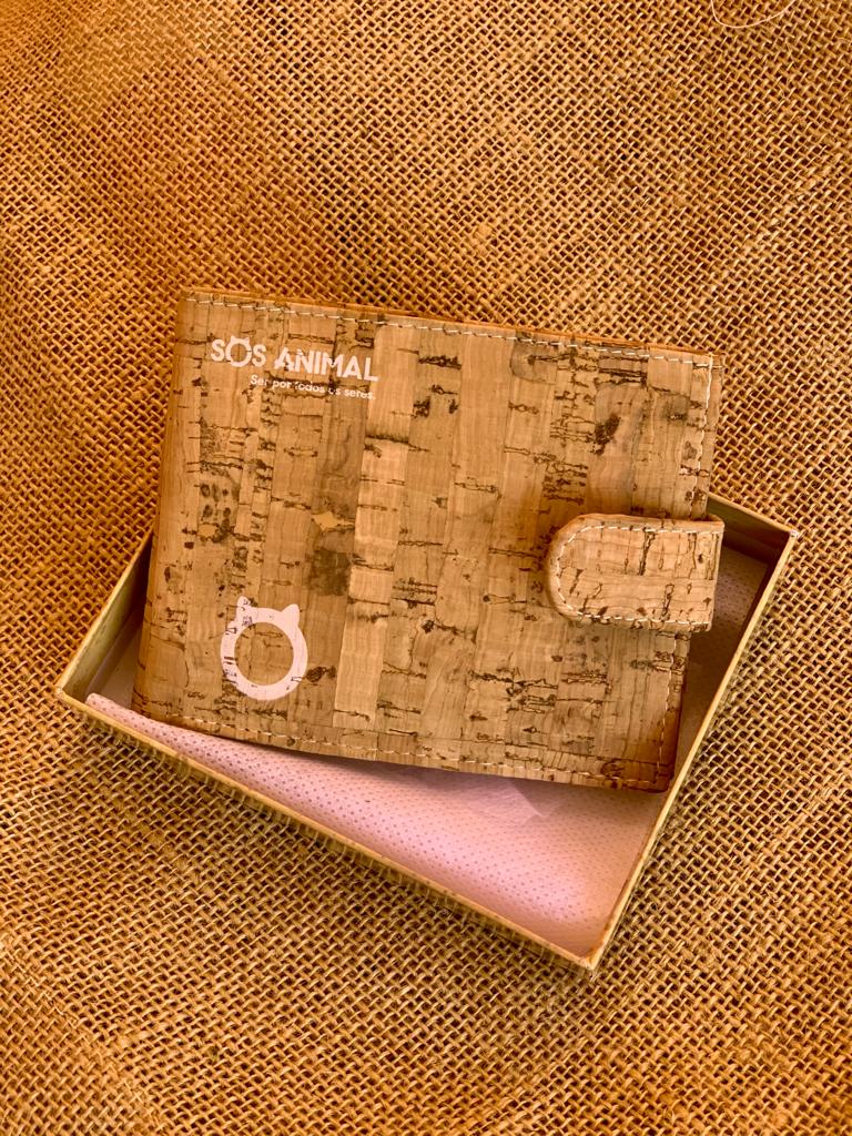 Carteira de cortiça com texto SOS ANIMAL dentro de caixa sobre tecido castanho