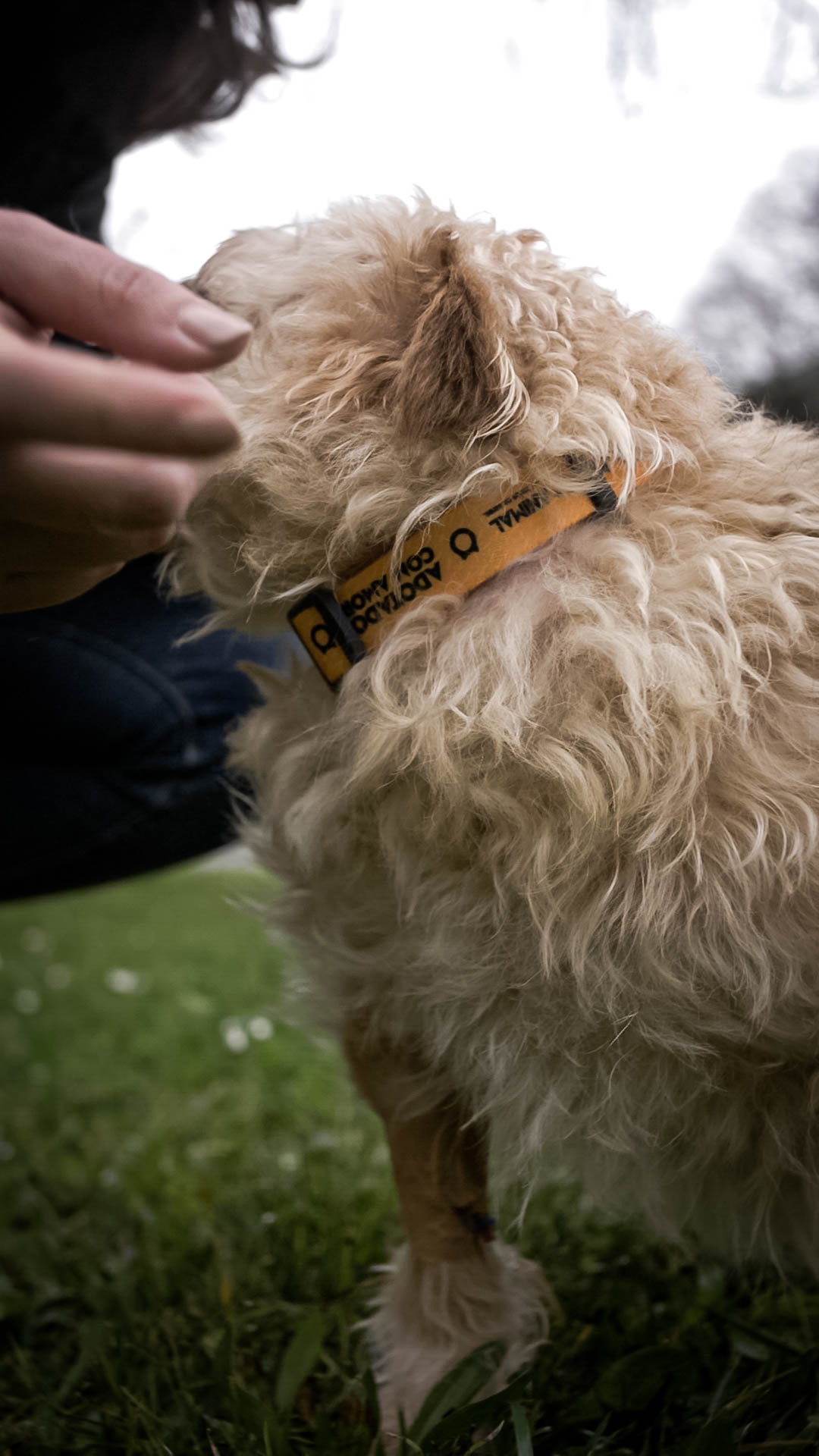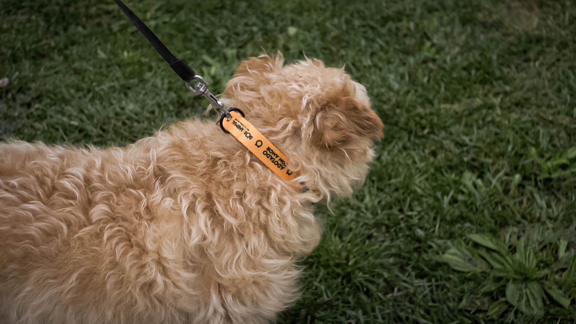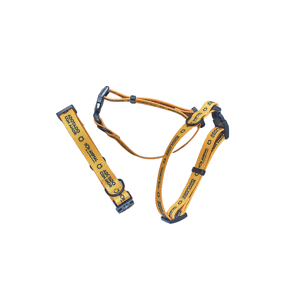 Coleira amarela com fecho preto e texto 'ADOTADO COM AMOR'.