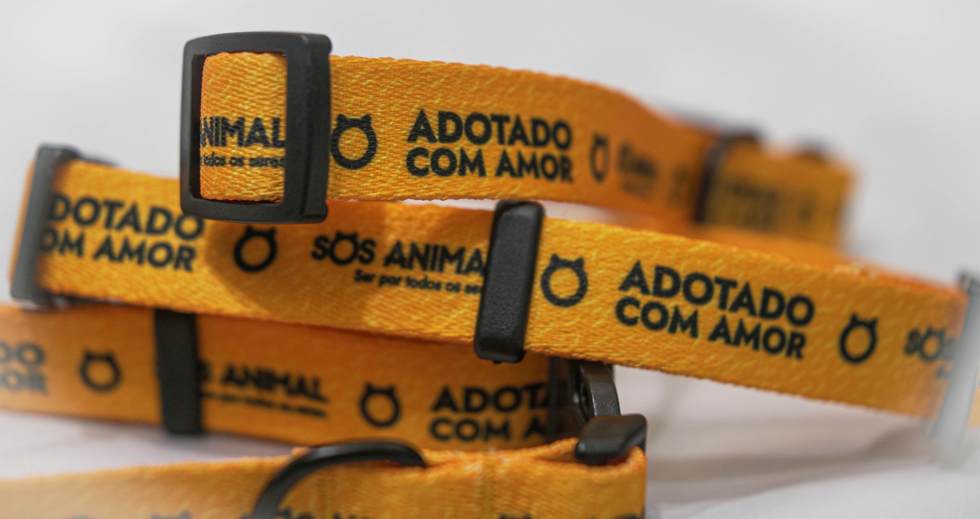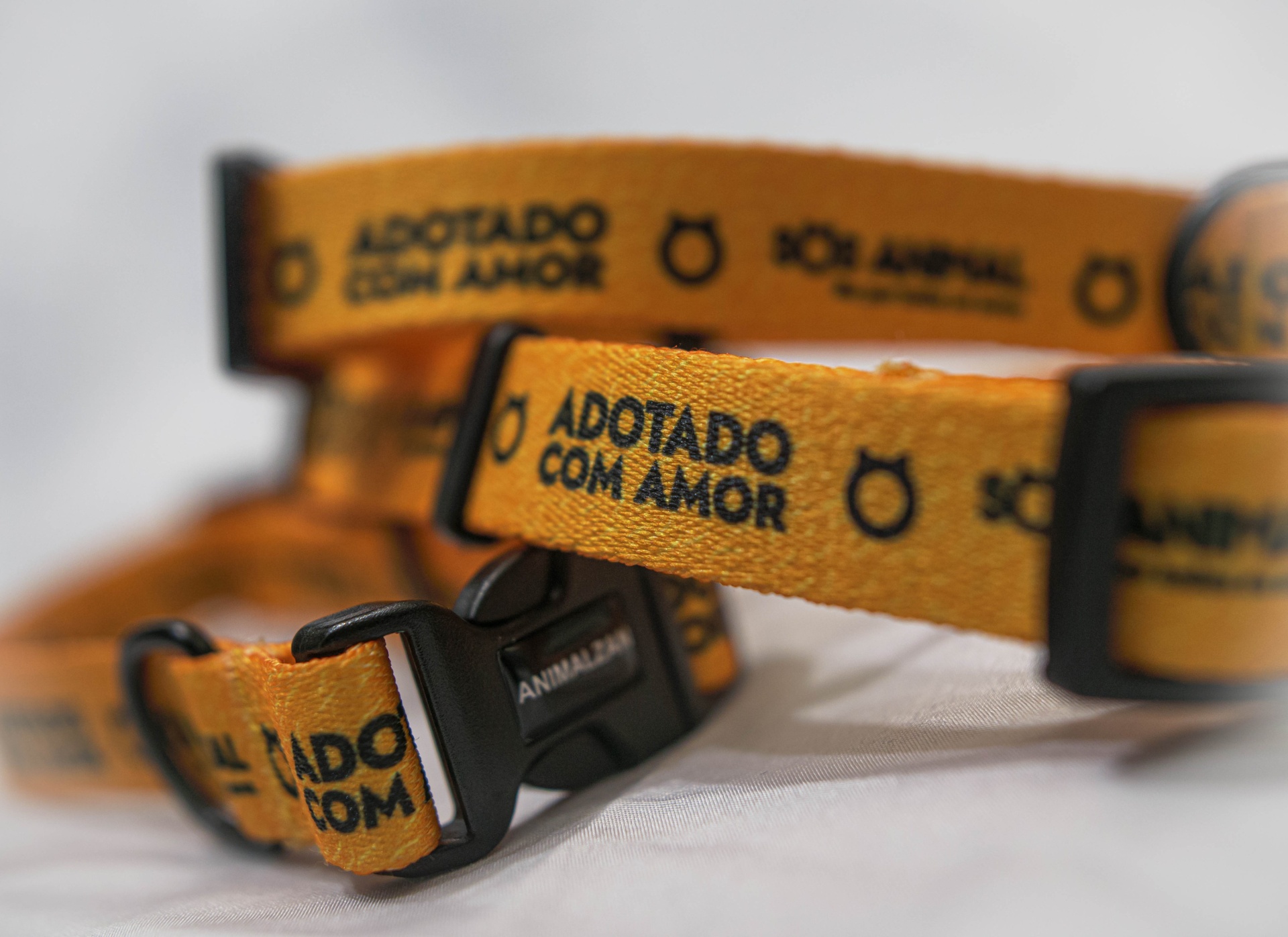 Coleiras amarelas para animais com texto 'ADOTADO COM AMOR'