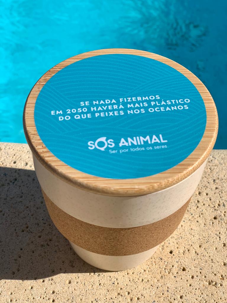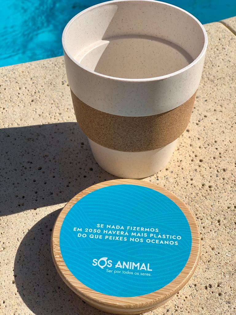 Copo reutilizável com tampa de madeira e texto ambiental no tampo azul