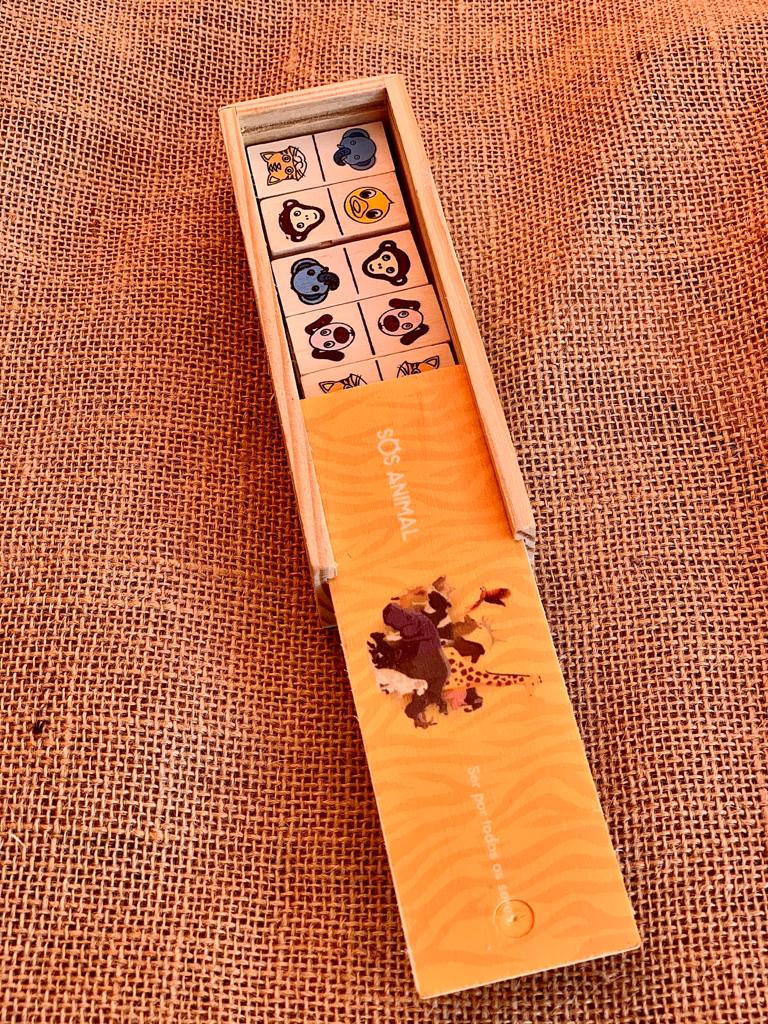 Dominó de madeira com 28 peças ilustradas com animais