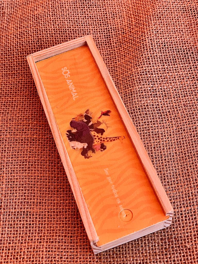 Caixa laranja com desenho de animais e texto SOS ANIMAL sobre tecido de juta
