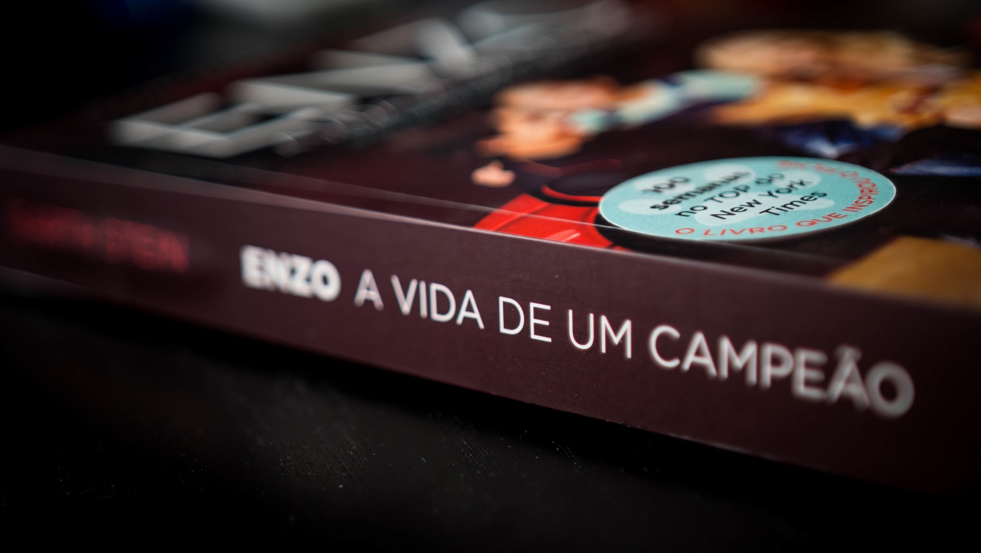 Livro 'ENZO A VIDA DE UM CAMPEÃO' com selo azul sobre superfície preta