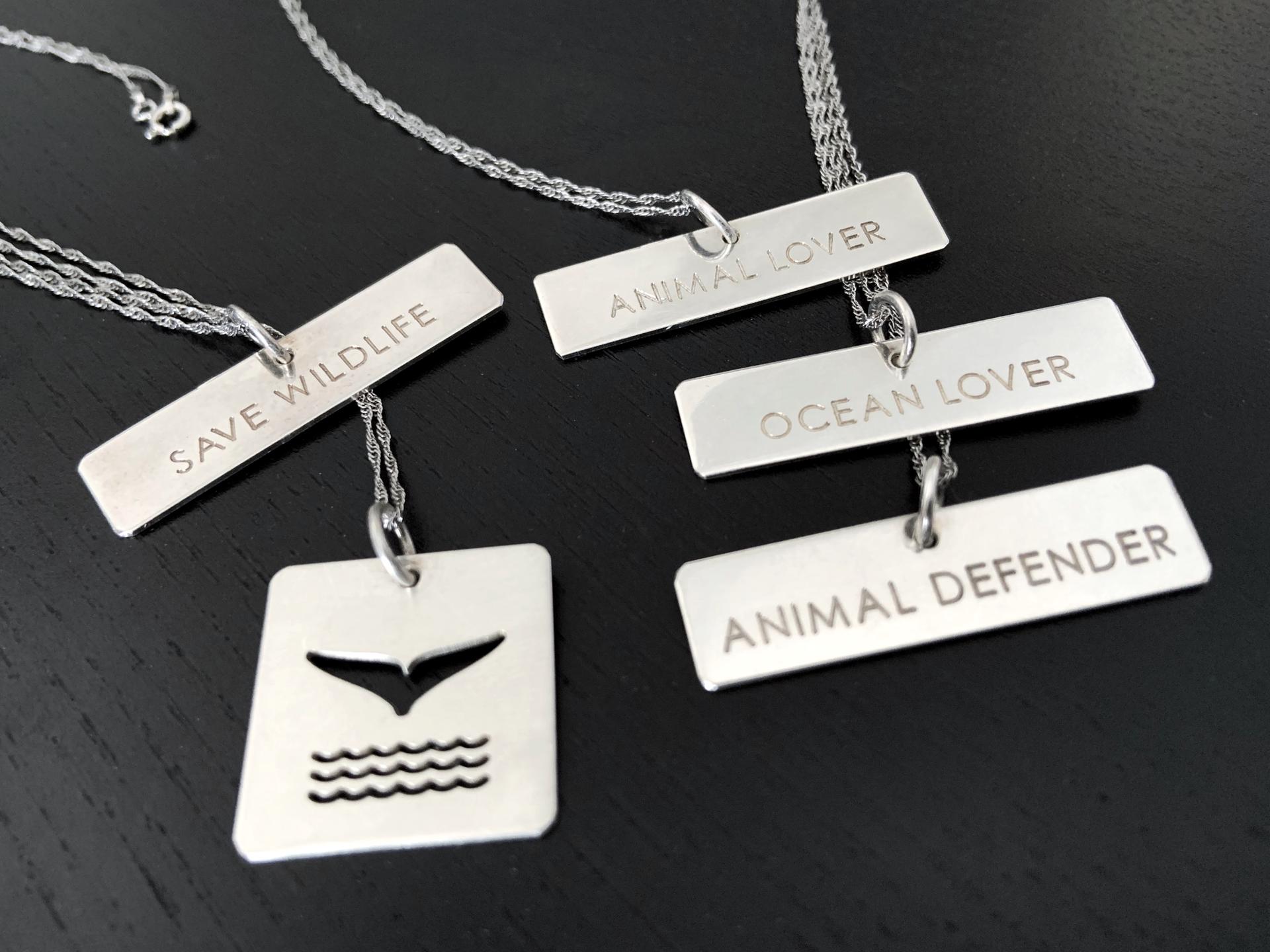 Colares prateados com pendentes gravados e imagem de cauda de baleia