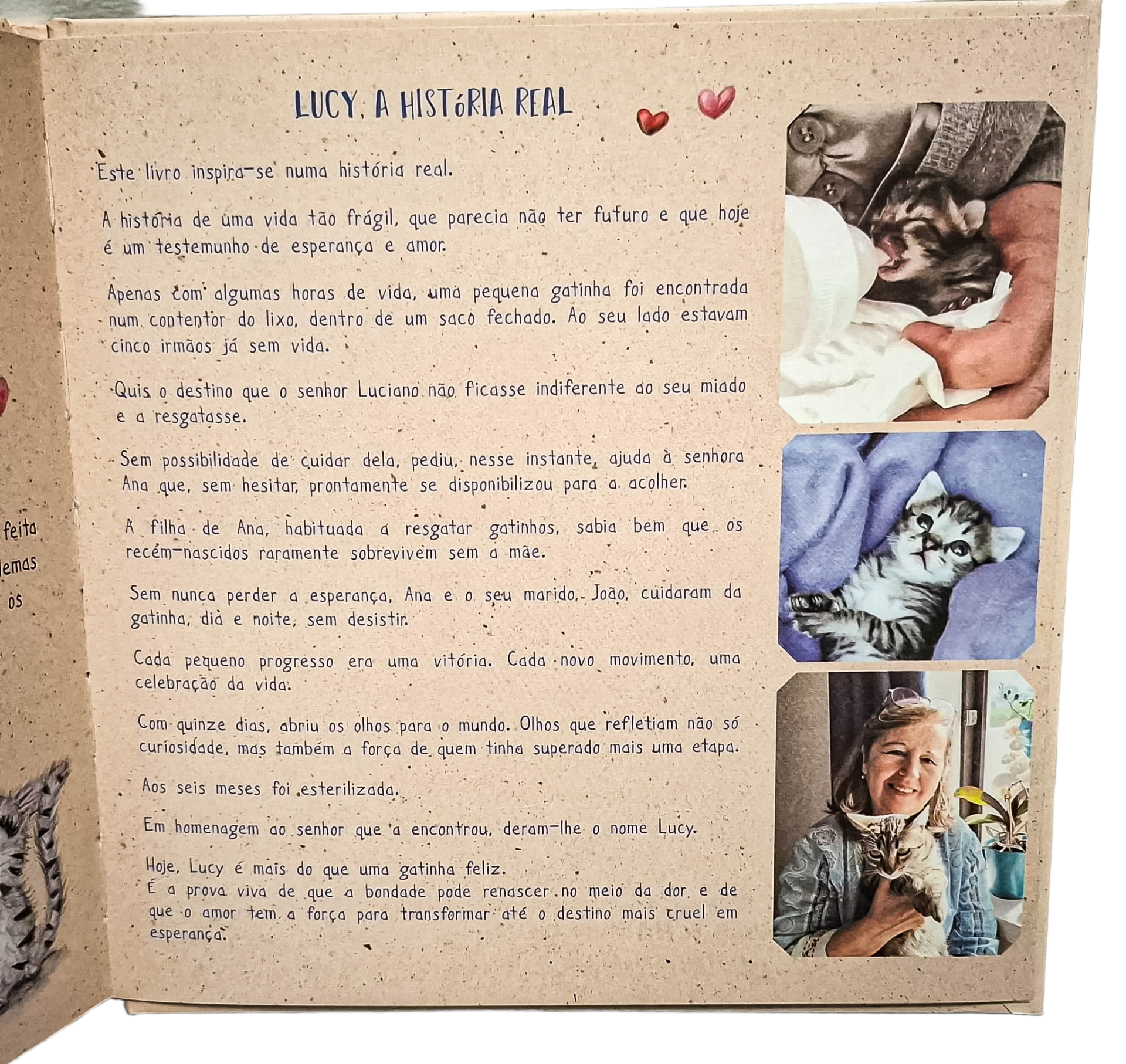 Página com texto em português e fotos de um gatinho e uma pessoa a segurá-lo.