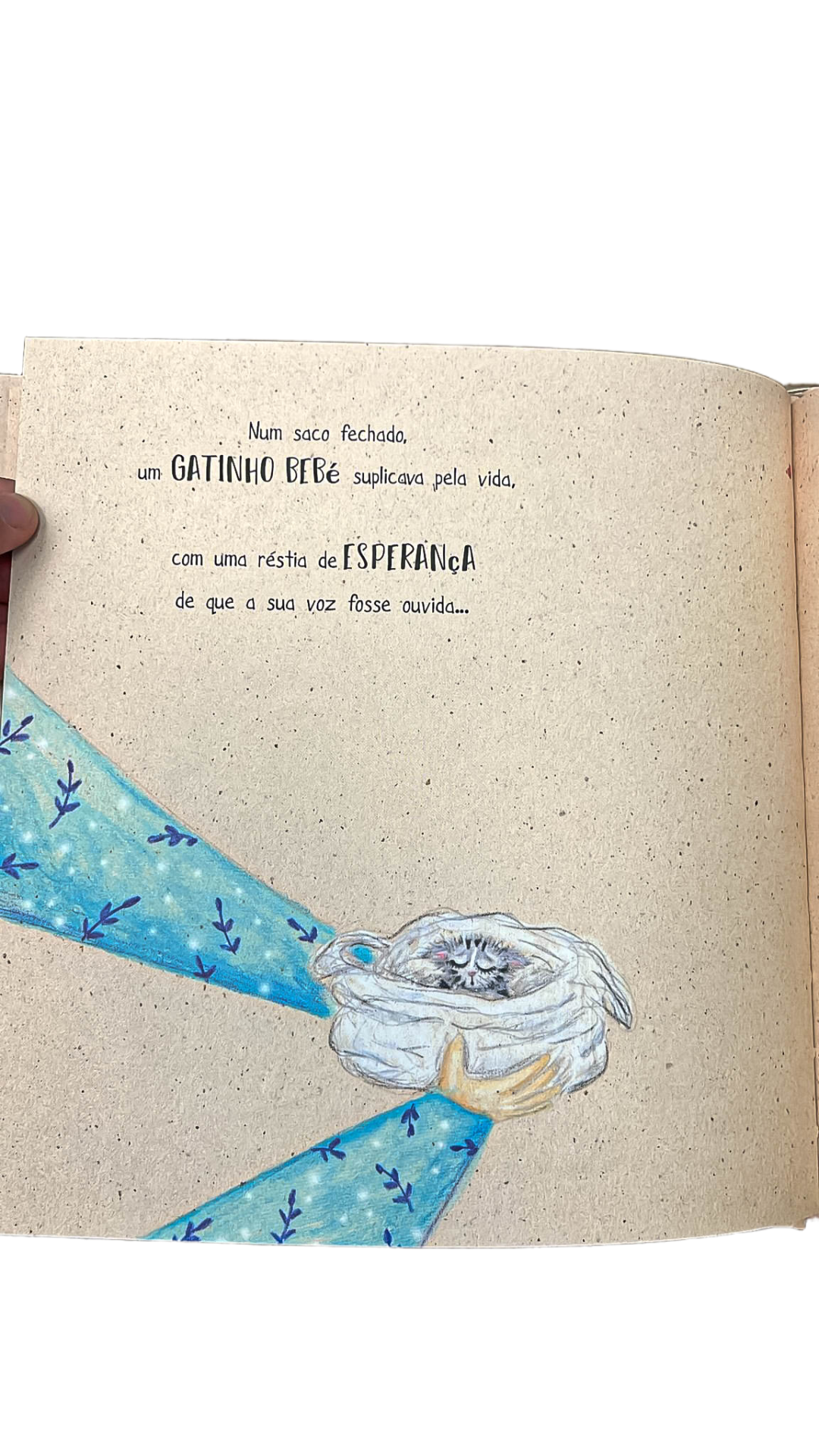 Página de livro infantil com texto e desenho de mãos segurando um saco com um gatinho bebé enrolado