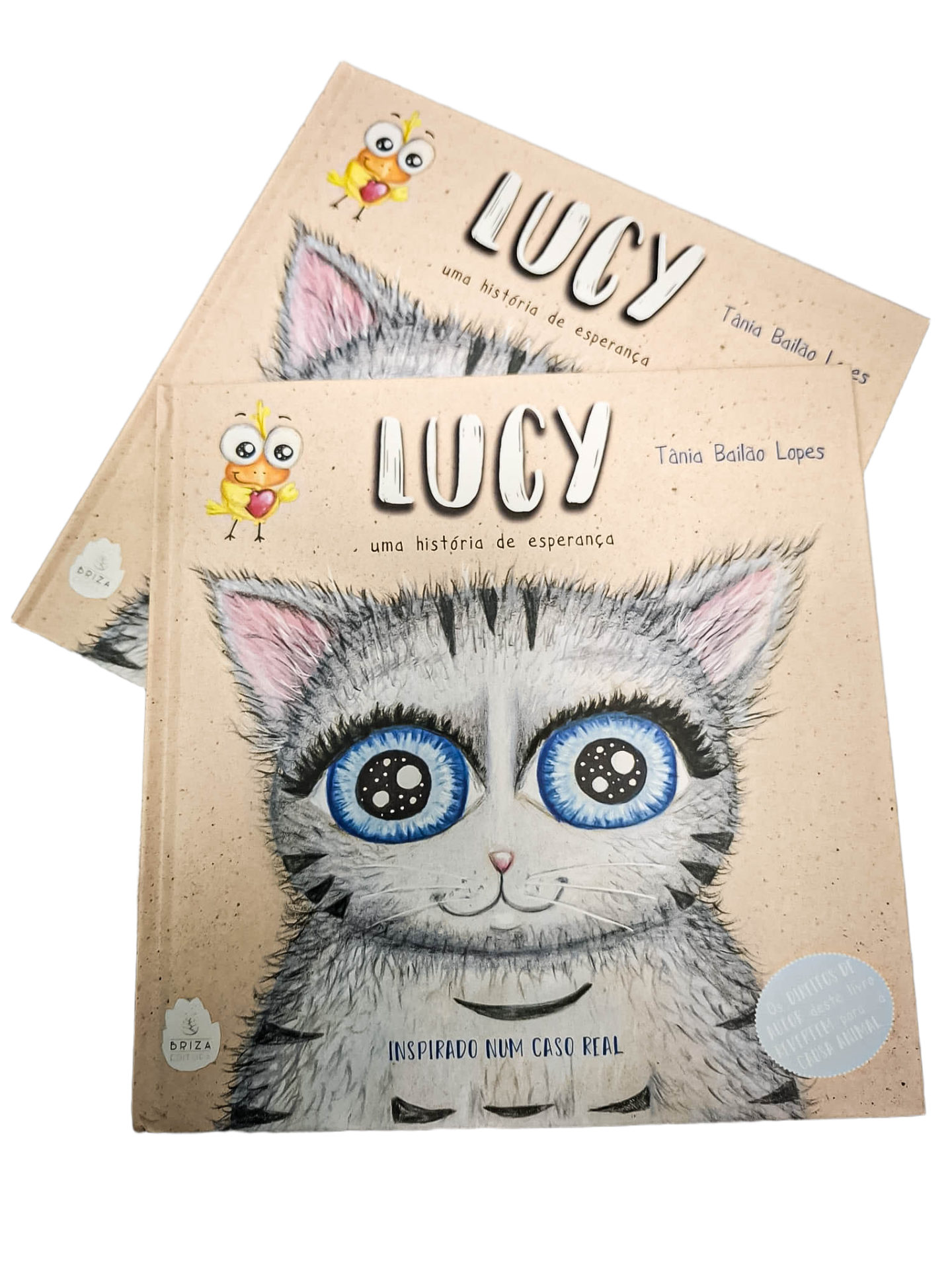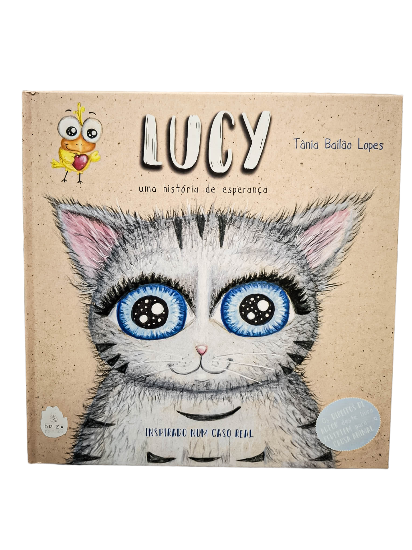 Livro infantil com ilustração de gato cinzento e olhos azuis no fundo bege