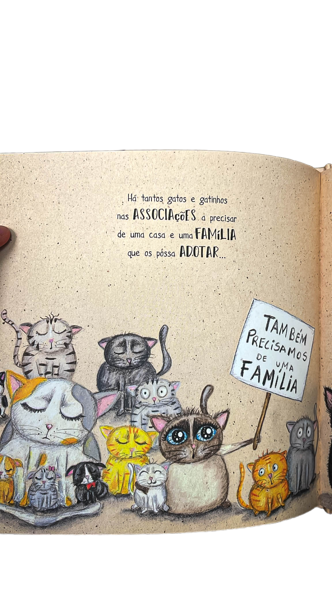 Ilustração de gatos em livro com texto sobre adoção e um gato segurando placa TAMbÉM PRECISAMOS DE UMA FAMÍLIA.