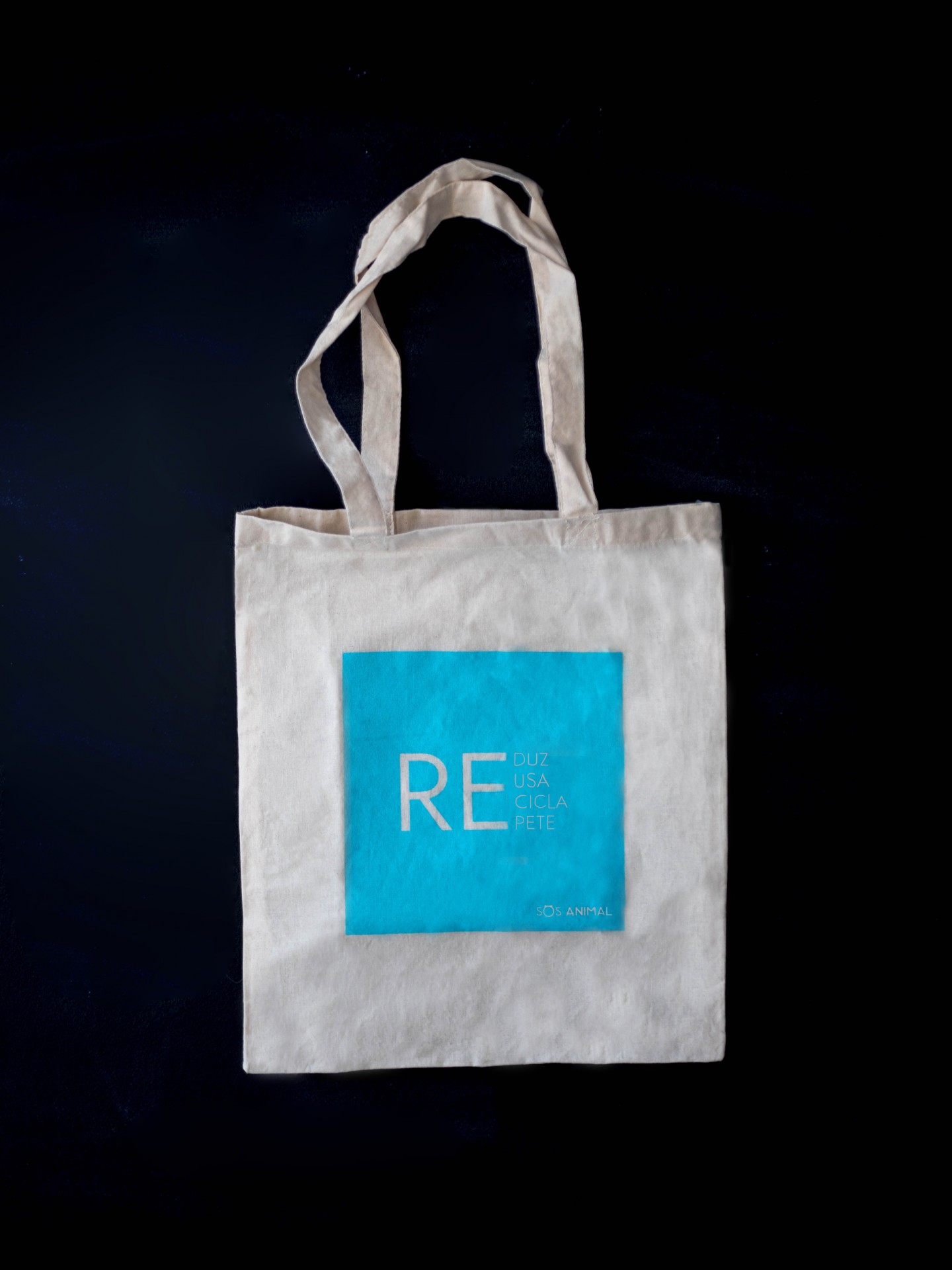 Saco tote branco com estampa azul e textos, sobre fundo preto.