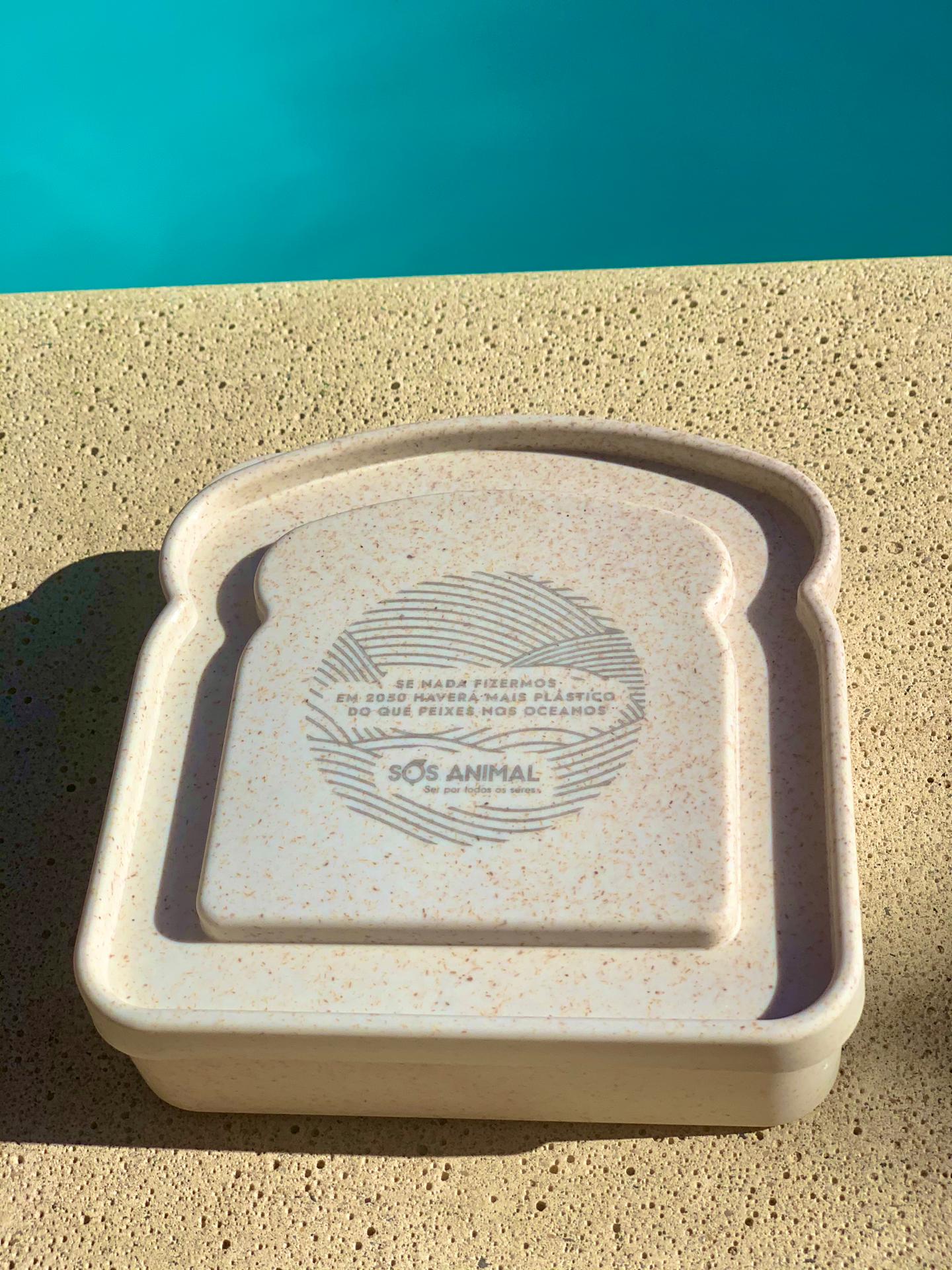 Conjunto recipiente e tampa formato fatia de pão cor bege com texto SOS ANIMAL.