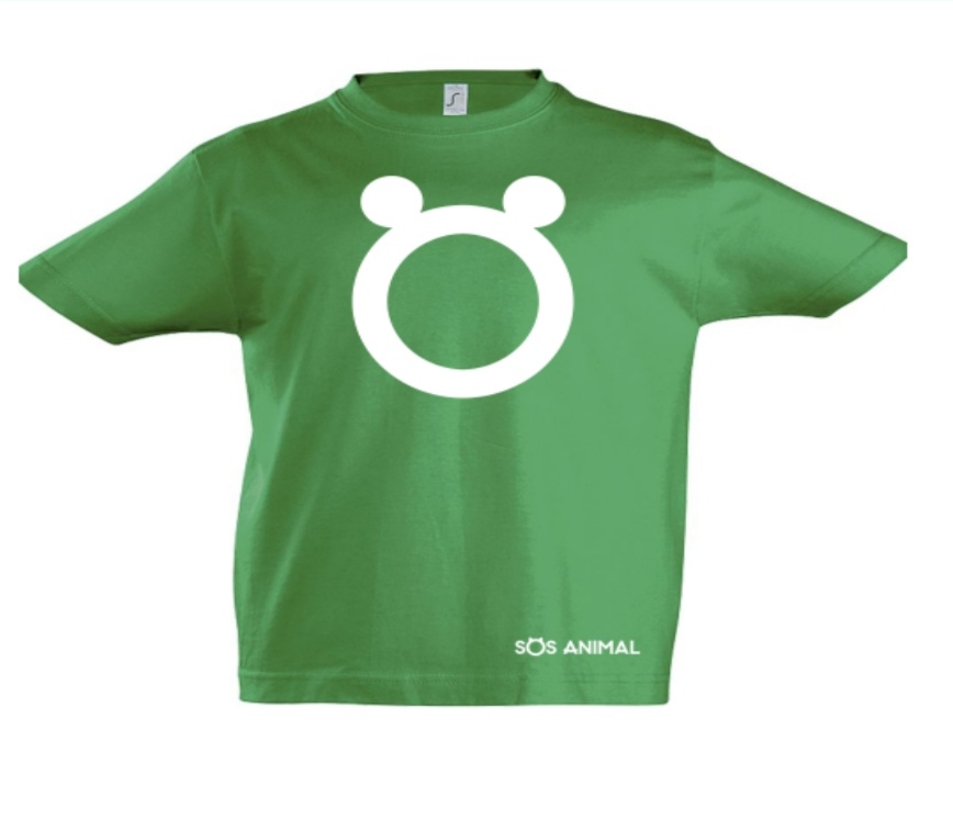 T-shirt verde com símbolo branco e texto SOS ANIMAL.