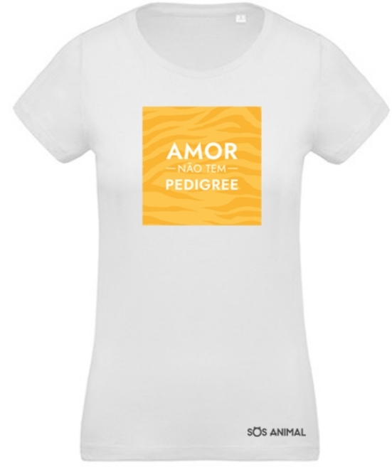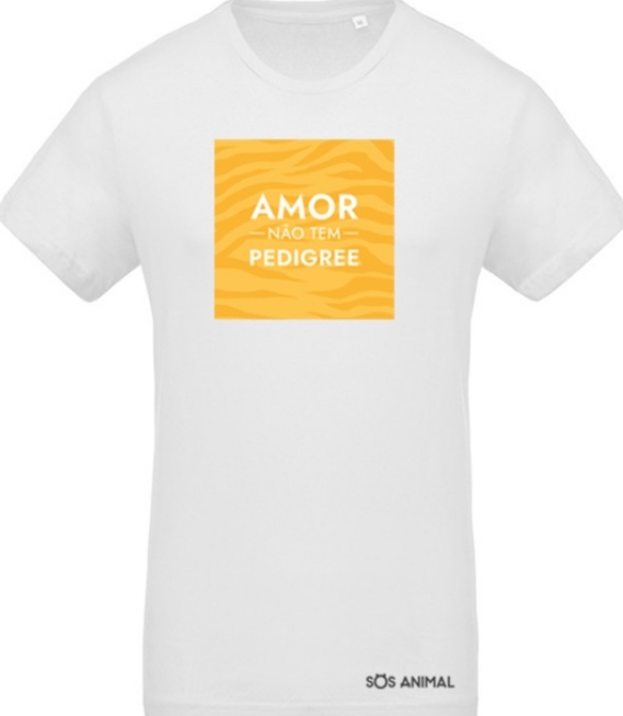 T-shirt branca com estampa amarela 'AMOR NÃO TEM PEDIGREE' e logo 'SÓS ANIMAL'.