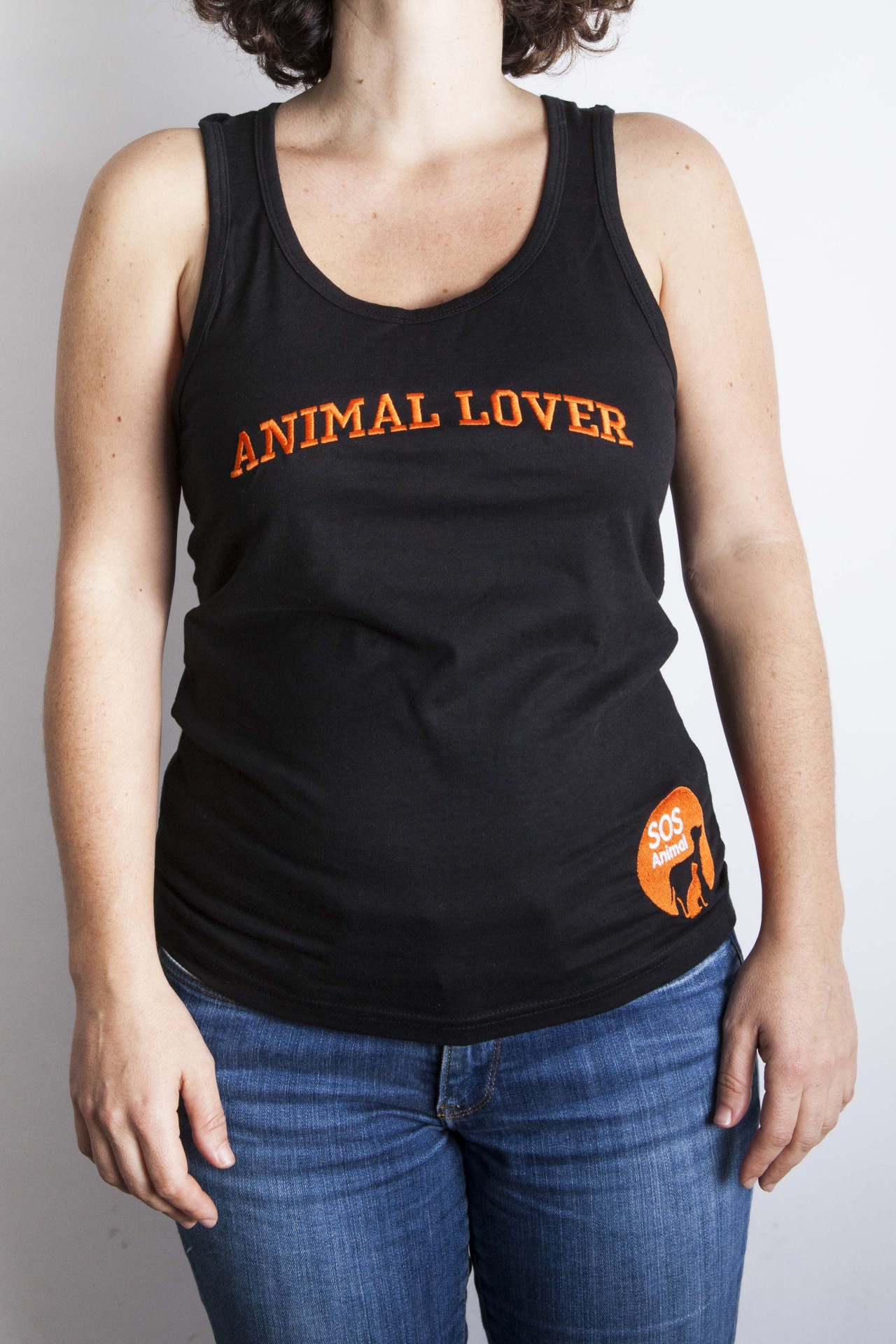 TOP em 100% algodão, com logotipo da SOS Animal bordado nas costas em grande e no peito a inscrição "Animal Lover" ou "Animal Rescue".