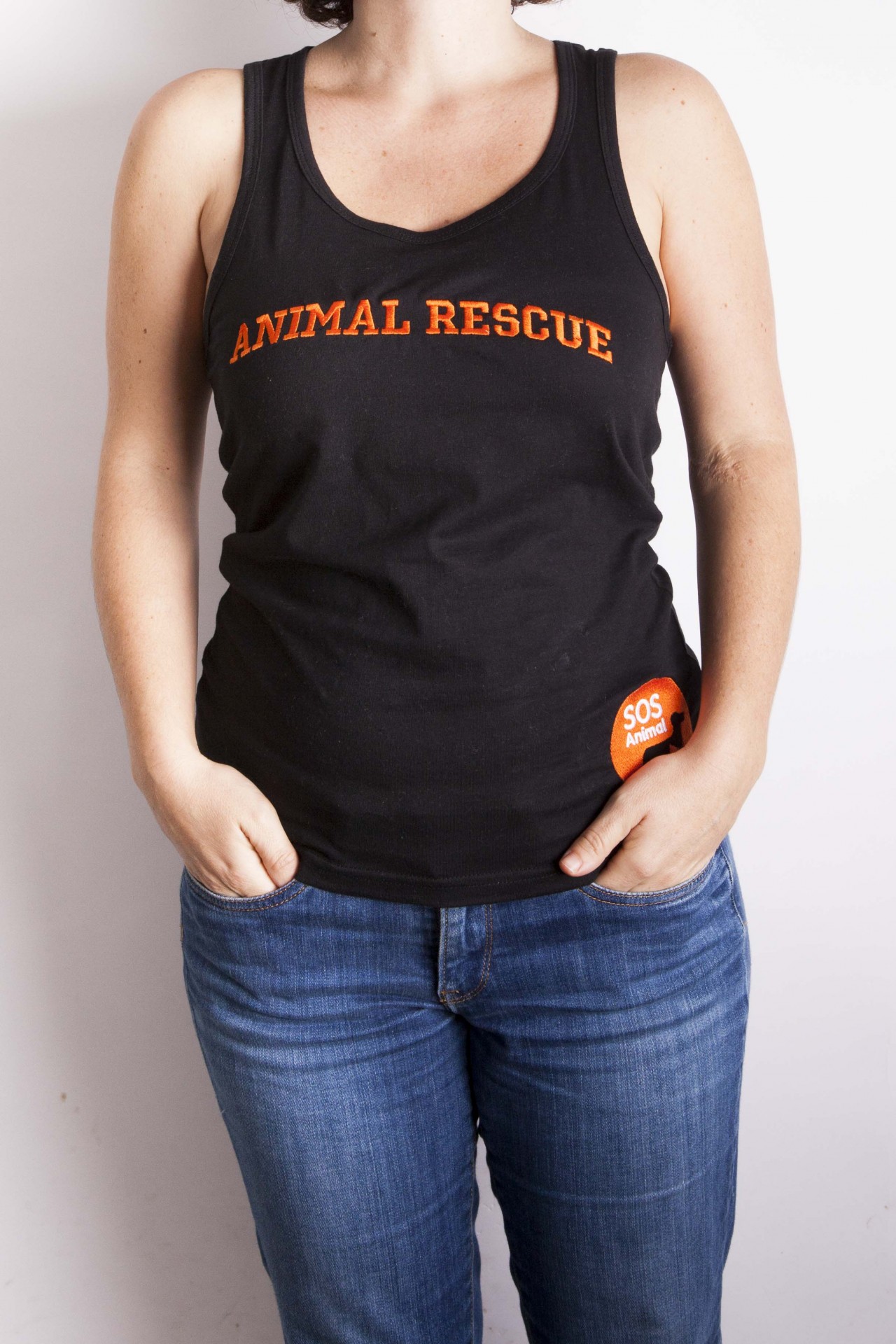 Camisola branca de alças com texto Animal Rescue e autocolante SOS Animal em fundo preto.
